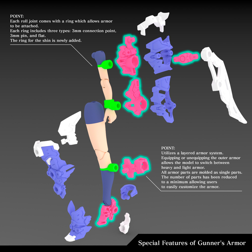 - The 3mm connection points on each part and head compatibility parts allow this model to be customized with existing M.S.G, Frame Arms, Frame Arms Girl, Hexa Gear, Sousai Shojo Teien, and Arcanadea series parts.